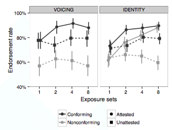 We can often study these questions using artificial language learning experiments. In one experiment, for example, we taught participants an artificial language with a simple phonological regularity, and tested how they generalized this regularity to new sounds: