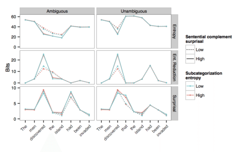 The probability of a word or a syntactic structure is a major predictor of how difficult they are to read. What are the syntactic representations over which those probability distributions are maintained? How is processing difficulty affected by the probability distribution we maintain over the representations we predict, and in particular, our uncertainty about the structure and meaning of the sentence?